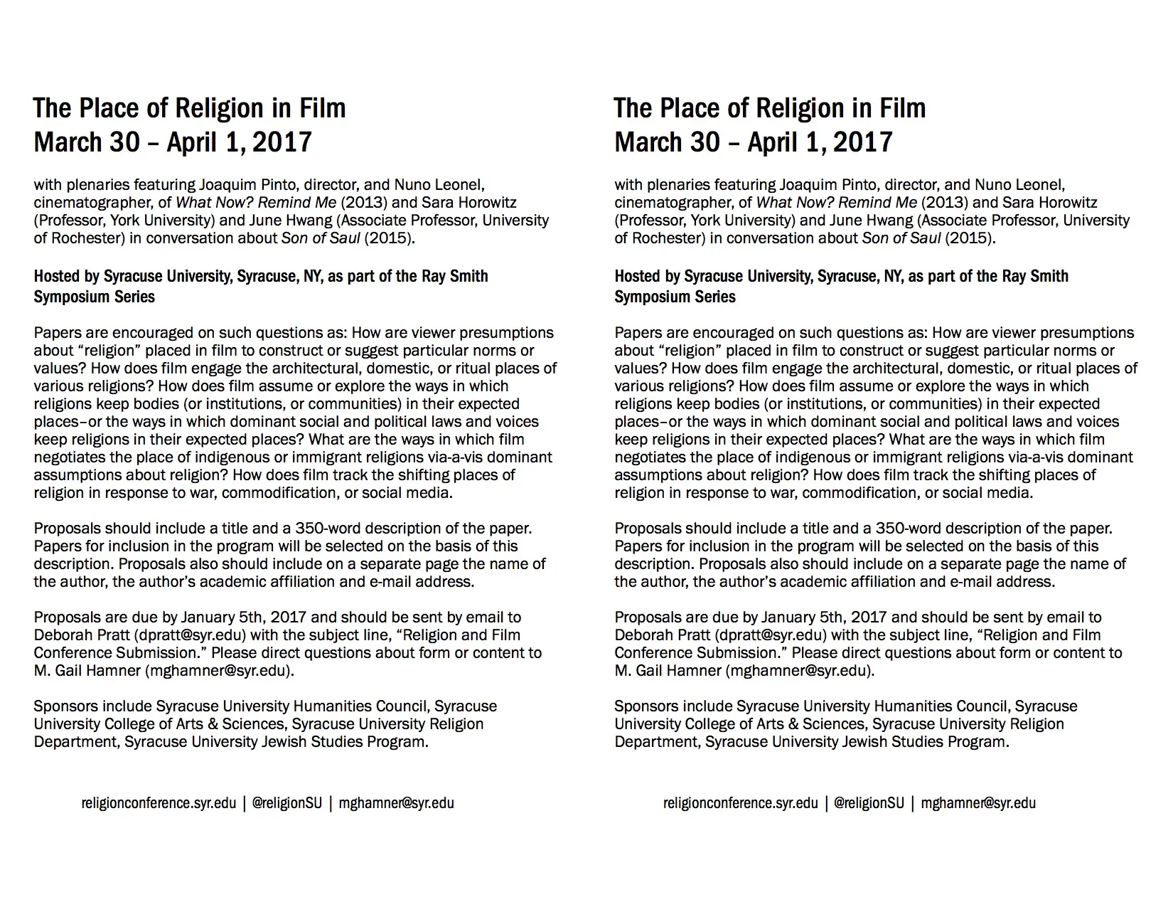- 2017 Handbill for The Place of Religion in Film Handbill front Handbill back
